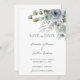 Det här är helt enkelt vackert Spara datumkortet har en dammig blå ro på en pristinvit bakgrund. Det är perfektens val att tillkännage din kommande bröllopsdag.