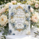 Invite your guests to a "happily ever after" event with this enchanting design that captures the magic of true love. Featuring graceful swans and lush floral details, this aesthetic perfectly sets the tone for a formal spring ceremony or a sophisticated winter celebration. The romantic imagery serves as a beautiful keepsake for friends and family long after the big day.A digital illustration featuring a faux gold baroque oval frame centered on a clean white marble background. Two white swans face each other at the bottom, creating a subtle heart shape with their curved necks. A lush wreath of watercolor dusty blue and white roses, accented with sage and eucalyptus greenery, surrounds the metallic-effect frame. Inside the oval, a black silhouette depicts a groom kneeling to propose to a bride, flanked by customizable monogram initials in circles. The event details are typeset in a mix of deep navy blue serif fonts and elegant gold-tone calligraphy script. Please note that all gold and marble textures are flat printed ink, not real foil or stone.