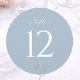 Elegant round wedding table number featuring a soft dusty blue background with clean white typography. The minimalist design with a large, easy-to-read number adds a refined and cohesive touch to your reception tables.