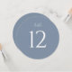 Elegant round wedding table number featuring a soft dusty blue background with clean white typography. The minimalist design with a large, easy-to-read number adds a refined and cohesive touch to your reception tables.