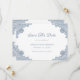 Rustiskt dammigt blått bröllop spara datum-kort med elegant blommigt snöre. Matchande objekt är tillgängliga. Anpassa enkelt detta dammiga blå bröllop spara datum med era uppgifter om bröllop.