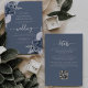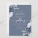 Den här inbjudan från elegant bröllop innehåller dammiga blåa blommigtar som är utfällda med silver faux foil grey i två hörn, på en dammig blå bakgrund. Anpassadet kombinerar silver grått serif, italic och handskrift typsnitt. Den omvända sidan ger plats för bröllop-information på en solid dammblå bakgrund, tillsammans med en QR-kodgäst som kan besöka webbplatsen och OSAN, vilket sparar kostnaderna för utskrift och utskick av separat OSA kort.