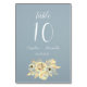 Dusty blue, elegant, chic, skript, calligraphy Bröllop bordsnummer. Enkel, minimalistisk blommigt. Trendig, budgetbordsnummer. Du kan anpassa med namn, nummer och datum.