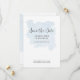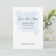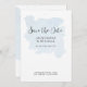 "Dusty Blue Simple Elegant Modern Script Watercolor Spara datumet." Elegant och underskattad, mjuk, dammblått vattenfärgsfärgad tvätta var handmålad på pappra. På den omvända sidan upprepas vattenfärgen färg tvättar förstorad med mer information till dina gäster. Artist av internationellt licensierad konstnär och formgivare, Audrey Jeanne Roberts, upphovsrätt.