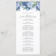 Ett vackert bröllopsprogram med en lush blommigt gräns av dammiga blåa vattenfärgblommor. Namnen på bruden och trippen och undernumren visas i ett dammigt blått serif-teckensnitt.