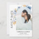 Den här fina spara-till-datum-designen har vattenfärgen vit, blå, guld, färg ro, knoppar och eukalyptus löv. Anpassa med din bröllop-information och hitta matchande utformningar från min "DreamHut"-butik.