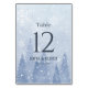 Det här bordsnumret har en romantisk, dammig blått vinterscen där gräs träd och vitt snöflingor tonas ned. Det finns även en motsvarande meny, blöjor och klistermärken. Detta är en del av en komplett bröllop-svit. Du kan klicka på anpassningsalternativet om du vill markera alla bordsnummer som du behöver.