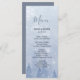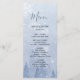 En underbar meny med en drömmande dammig blå vinterscen där gräs träd och vitt snöflingor tonas ned. Mesmeriera dina gäster med detta sereniska och planetsmässiga landskap. Det finns även matchande blöjor och bordsnummer-kort. Detta är en del av en fullständig samling i bröllop.