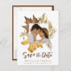 Dusty Brown Höst löv Elegant Rustic Fall Wedding Spara postkortet för datum. Söt, elegant och moderna bröllopsinbjudningar till ditt speciella tillfälle! Perfekt för den vackra hösthögsäsong som lugnar hösten! Vattenskärg mörk ljusbrun och guldfärgad gult höstblad löv gräns med en mängd maple löv, ek löv och torkade blommor ramar överst på er firande i bröllop. Din namn finns i modernt teckensnitt högst upp och på omvänt kort visas en mörk brun mönster-bakgrund längst bak. Anpassa information om bröllop, datum, plats och annat på framsidan.