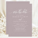 Den här minimalisten sparar datumkortet med vackra dammiga lavender-nyanser parade med kalligrafiskript för elegant. Med en modern och enkel utformning är detta mångsidiga kort perfekt för vilken säsong som helst - vår, sommar, vinter eller fall. Det utesluter en snyggt- och klassvib, perfekt för ett romantiskt, chic- eller sofistikerat bröllop-tema.
