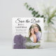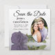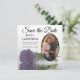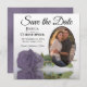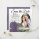 Denna vackra moderna blommigt som sparar datumkorten är perfekten för att låta dina vänner och familj få veta om ditt kommande bröllop. De har en elegant som är utformad med en enda dammig lila eller lavender färgad ro som reflekterar i ett bassäng av vatten med vinkara och krämer med ditt foto i en ovalformad ram på en klassisk vit bakgrund. Rubriken läser Spara datum med utrymme för namnen, datum och plats. Baksidan är en marmorerad lila grått färg.