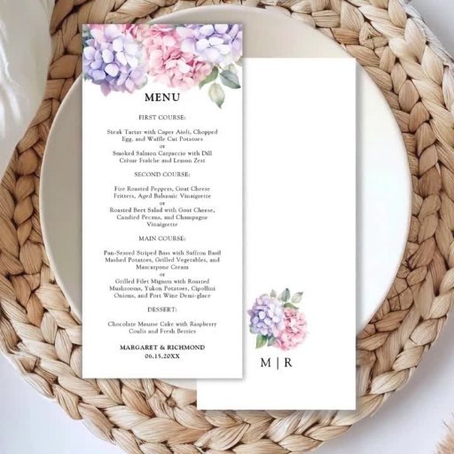Lägg till lite elegans i bröllop med vår "Dusty Lila & Rosa Hydrangea Bröllop Menu". Som ett komplement till vår samling lovar den här menyn att imponera på dina gäster. Köp nu och ställ in en minnesvärd matupplevelse!