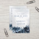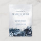 Ett dammigt blått, grått- och marblått (ingen grönt eller annat färg) bröllop-OSA-kort med vattenfärgspmålat marint blått och dammigt blå blommigt med silver blå eukalyptus grey och online av stänk och dammig blå vattenfärg silver bakgrund. Baksidan av skrivorna, "Anslut till oss på", med din webbplats adress, och ett meddelande som säger "Vi ser fram emot att fira med dig".