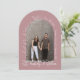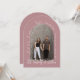 Det här är ett romantiskt sätt att spara datumkortet med en dammig rosa i ro-format som innehåller ett bågfoto ram i mitten. Kortet innehåller en elegant vit botanisk konst med delikat löv och grenar, texten "Spara datum" överst i ett flytande skriptteckensnitt och parets namn vid grund i matchande skript stil. Ytterligare detaljer om bröllop visas lodrätt längs högerna och skapar ett mjukt, modernt estetiskt med rent linjer och muterat färg.