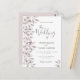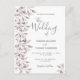 Ett trendigets bröllopsinbjudan i dammig ro och vitt. En vit chic på framsidan. Dekorerad med botaniska dammiga färgader från ro och löv. Modern stor, hanterad text, typografi med texten: bröllop i. Mallar för namn och bröllop. Grått text. Baksida: ljusdammig bakgrund i ro.
