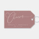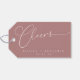 Denna dammiga ro-favärde-tagg har en flytande "Cheers" i modern kalligrafi, med utrymme för att anpassa namn och datumen under. Den här produkten är designad för bröllop, duschar eller festliga händelser och ger en romantisk beröring till party favors eller presentpåsar. Den här märkrn är idealisk för snyggt par som detaljerat beskriver kärlek, elegant.