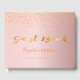 En gäst bok för en glamorös, elegant och modern bröllop. En chic dammig övertoningsbakgrund i ro med gyllene konetti sprinkle. Texten: Guest Bok är skriven med trendiget faux guld brev. Namn och datum är skrivna med ett handskript i stil, Gulden brev. Mall för text på ryggraden, grått-text.