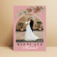 Merry & Married Dusty Rose Winter Pine Cone Greenery Botanical Photo Christmas Card - Muted Pink Christmas Photo Card for Newlyweds - Celebrate your first Christmas as newlyweds with this elegant holiday card featuring a light pink background with white accents and festive pine greenery. The trendy arch-shaped photo frame highlights one cherished image—ideal for a wedding or engagement photo. Beautiful calligraphy adds a romantic touch, and the back includes an editable message area for personalized greetings. A stylish way to share winter wishes and mark your "First Christmas as Mr. & Mrs."