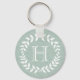 Tillbehör i stil med den här personlig mint-grönten och den vita engrammade nyckelkedjan. Utformningen har moderna löv för krans och snyggtens typografi som inledning. Monogram i mitten är enkelt att anpassa. Gör en elegant och en användbar bridesaid, marskalkar och brudens sida-nyckelpresentidé och komplimenterar chic bröllop greenery.