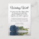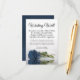 Detta vackra bröllop-kort är ett smakfullt sätt att be era gäster om pengar eller pengarar i stället för presenter. Elegantens utformning har en dammig stålblå färgad ro som reflekterar i vatten med vinkara och krämer. Titeln lyder "Wishing well" med en söt dikt: När vi börjar med vårt nya liv som Mr. Och fru, vi har redan ett hus med fullt, men om ni vill ge oss ge en present skulle en gåva från några pengarar vara så trevlig! Det finns plats i grund för en kort-not och namnteckning.