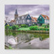 Färgning av traditionella träfiskehus, kanal och svan i Marken, Nederländerna. Visa kanal, bro och traditionella fiskehus i byn på vattenland. Traditionella Hollandsymboler.