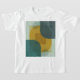 A modern, abstract geometric poster design featuring overlapping translucent shapes. The composition is divided into four quadrants with textured, muted background colors (soft teal, light sage, dark charcoal/slate). Central to the design are a large, vibrant mustard yellow curved shape and several partially visible, translucent teal/grey circles and rectangles. The artwork is characterized by its sharp lines, clean edges, and contemporary color palette, creating a sense of depth and dynamic movement through the interplay of transparency and opaque forms.