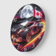 Ett glimt hot rod roar sig med lågor, tävla längs en mörk vid ett stillastående sjö, upplyst av fullt måne och åtföljd av en kanadensisk flagga.