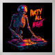 Ett dynamiskt och dynamiskt exempel med ett glödande skelett som bär stora hörlurar och som på ett imponerande sätt blandar musik på en uppsättning vändbord. Bilderna användor högkontrast, elektrisk neon-färg (rosa, cyan, gult) för att tända benen och apparaten mot en naken svart bakgrund. Uttrycket "PARTY ALL NIGHT" glöms i att matcha nyettering.
