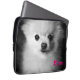 Förtjusande Pomeranian valphund! Nära övre svartvitt fotograferar av ett charmigt blont Pomeranian hundansikte.