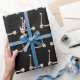 Roligt E-scooter-mönstrat presentpapper. Ljusfärgade elscootrar, mönstrade på en mörk bakgrund.