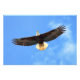 Foto av en örn som flyger mot ett starkt blå himmel med några små moln, dess vingar är utsträckt. Detta är ett bild av ett moget örn under flygning som har tagits i British Columbia, Kanada, som har en hög koncentration av denna stora våldtäktsman. En flygörn är en fantastisk att se!