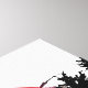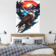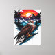 Digital illustration of a red-tailed hawk perched on a blue splattered rock. The hawk has detailed brown and white feathers, yellow talons, and a sharp yellow beak. Behind it, a vibrant sunset with a red-orange sky, silhouetted pine trees, and snow-capped mountains. The background features dynamic brush strokes and splatters, blending realism with abstract art styles. The overall color palette includes rich browns, whites, blues, and reds.