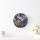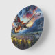 En vacker örn som ligger ovanför en stad som fortfarande sömnig medan sol kommer upp över berget.