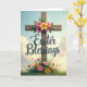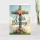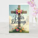 Designed with a rustic wooden cross at the center, the scene shows strong wood grain rising from thick green grass, like a steady presence in a spring field. Where the beams meet, a full bouquet spills outward, with pink daisy-like flowers and one golden-yellow bloom with a soft orange center tucked into deep green leaves. Near the base, more flower clusters in orange and pink dot the grass, their close spacing suggesting a gentle togetherness, like friends leaning in for a shared moment 🌷. Across the upper portion of the image, the words “Easter Blessings” appear in flowing dark lettering, set clearly against the open sky. The background fades from clear blue at the top to a warm golden glow near the horizon, adding a tender, affectionate warmth to the whole scene 🐇. Light touches the petals and the wood edges, giving the flowers a soft shine without overpowering the earthy textures. A few pale, sunlit clouds hover low near the horizon line behind the cross.