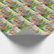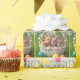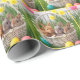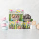 Four adorable bunnies are nestled in a white wicker basket with small flowers, surrounded by brightly colored Easter eggs and vibrant blossoms in the grassy background