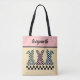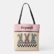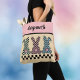 This playful Easter bunny tote bag has a cute and playful checkerboard design with the rear profile of 3 cute bunnies and their cotton tails, decorated in a checkerboard pattern. Each bunny is a different color alternating with black squares: mint green, pink, and a soft blue-teal color against a yellow background. Your name appears in a script font at the top against a color block of dusty pink. Make sure to type the name in the Personalize box. This tote would also be a great sturdy bag for an egg hunt for years to come.