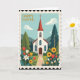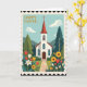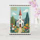 This Easter card shows a peaceful countryside scene centered on a small white chapel with arched windows and a red-roofed steeple topped by a simple cross. A postage-stamp style border frames the artwork, giving it a cozy, old-fashioned look. A pale blue sky with soft white clouds hangs above rolling green hills, while tall evergreen trees stand on either side like quiet companions. A light gray path runs straight to a dark wooden door, inviting two friends to stroll up together and share a gentle moment. In the foreground, a garden overflows with red and golden tulips 🌷, white lilies, and yellow sunflowers, their petals leaning toward one another as if in a tender greeting. The words “HAPPY EASTER” appear in the upper left in golden letters, set neatly against the sky for easy reading. The colors stay soft and springlike, with the bright flowers adding warmth against the calm greens and blues 🐰. The chapel sits slightly above the flower beds, with the path dividing the garden into two balanced sides.