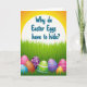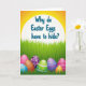 This design shows a bright yellow-to-orange arc near the top, like a rising sun warming the scene, and inside its soft white curve the question “Why do Easter Eggs have to hide?” appears in rounded blue lettering. The text sits centered within the arc, giving it a friendly, inviting look that feels like a gentle nudge from a close friend. Below, a wide field of rich green grass fills the lower half, with blades overlapping and curling as if they’re leaning in together. Tucked among the grass are several decorated eggs, half-hidden in a way that suggests a sweet little secret being shared 🐰. One egg is deep purple with light polka dots, another is green with stripe patterns, and a brown one has a textured look that adds cozy contrast. Small touches of pink, blue, and orange appear across the eggs, tying them back to the warm arc above and adding a soft, affectionate energy 🌷. The grass is layered thickly around the eggs, with the brightest highlights catching along the tips of the blades.