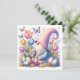 A vibrant Easter greeting card featuring a whimsical gnome in a polka‑dot outfit sitting among bright tulips and decorated Easter eggs. A sweet gray bunny with a pink ribbon nestles beside him, while colorful butterflies flutter overhead. The lively colors and playful fantasy style make this card a delightful choice for celebrating Easter and the magic of spring.