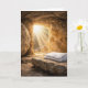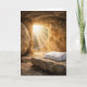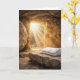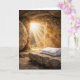Sunlight pours into a stone tomb, illuminating a folded white cloth on a rocky surface while the entrance, framed by large stones, creates a calm contrast between light and shadow.
