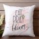 Dekorativ kudde med elegant med rosa vattenfärgspenseldrag och ord "Eat Pray Bloom". Samordna utskriften av rosa och vitt snöre på baksidan. Visa hela vår dekoration i Zazzle-butiken!