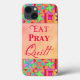 "Eat Pray Quilt" i ord säger att det är en kvarter på det här iPad-fallet som visar kärlek på att du håller på att tappa. Dessa ord är i röd text med 3 olika typsnitt och centreras mellan två färgstarka fempunktsblock gräns på en gult och koralltexturerad bakgrund. Gräns innehåller favoritblock, t.ex. loggstugan, stjärnor, fyrkantiga block och andra samt ett maskerat blomblock. Färg är rött, rosa, gult, orange, turkosblått, korall och grönt. Den här originalkonsten är efter strukturdesignern Phyllis Dobbs och koordinerar med andra produkter i den här butiken. Fullständigt anpassade