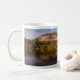 Det vackra Echo Sjö i New Hampshire's White Mountains. Toppen hösten färg tillför skönhet till scenen. Fullt figursätter mugg.