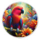 En livfull målning av en Eclectus-papegoja omgiven av en levande uppsättning färgstarka blommor. De invecklade detaljerna belyser papegojans slående och de tropiska blomningarna, vilket ger en exotisk och glad beröring åt möbler eller torka biet.