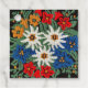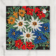 En bild av ett blommönster med ett nålverksutseende av Edelweiss vita Alpina blommor i Europa på din produkt. Blått, rött, gult och vitt färg. Leontopodium alpinum från Schweiz, Tysklant, och Österrike.