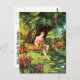 vacker färgrik vintage-målning av Adam i Edens trädgård med vackra blommor, träd, sjö, lejon, påfågel, hjort och elefant, och fåglar, med Adam som sitter ner vid vattnets kant och smeker hjorten. vacker målning med Adam från historien om Adam och Eva i Genesis i Gamla testamentet, när han sitter bredvid vattnet sitter en hjort nära honom, ett lejon tittar på, en papegoja sitter i ett träd, en påfågel sitter på en trädgren och en elefant kommer mot honom i fjärran, med rosa och lila blommor, stor palmer och sjöar.