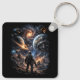 A lone astronaut stands on an alien world beneath swirling galaxies and distant starships, ready to face an epic cosmic conflict.
