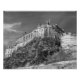 Fotografi med svart och vitt av Edinburgh Castle sitta atop Castle Sten, taget från Grassmarket area of Edinburgh. slottet har varit inblandat i många historiska konflikter, däribland krig från Scottish Independence på 1400-talet och Jacobite Stigning 1745. slottet påstår sig vara det mest belägrade byggnaden i Underbara Storbritannien och ett av de mest angripna ställen i världen.