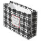 En redigerbar presentpåse med skript och dekorativ brev på ett fyrkantigt rutmönster i rött på ett svartvitt glen-inspirerat vågrät, la mönster med tunt rand.