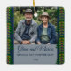 This beautiful ornament features a photograph (you switch it out for your own photo) against a solid background (you can change the background colours) and a garland of leaves and berries down the sides. At the bottom, it has their names, a message (growing old together since ...year). The text on the front is editable so go ahead and change the words as well as the font style, size and colour. The background colour on the back can be changed, too.